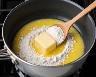 Orta boy bir sos tenceresinde tereyağını eritin. Yağ eriyince unu ekleyin ve sürekli karıştırarak kısık-orta ateşte 2–3 dakika kavurun. Renk almamalı, sadece un kokusu gitmeli.