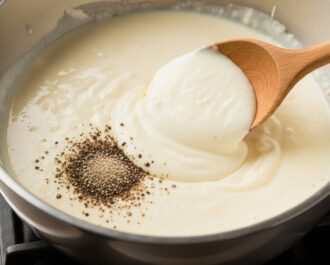 Sos hafif koyulaşmaya başlayınca tuz, karabiber ve istenirse biraz muskat rendesi ekleyin. Karışım kaynamaya başladığında altını kısın ve 2 dakika daha pişirip ocaktan alın.