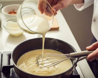Sütü yavaş yavaş ve sürekli karıştırarak ekleyin. Çırpıcı kullanarak topaklanmayı önleyin.