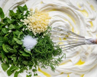 Ezilmiş sarımsak, tuz, nane ve doğranmış dereotunu ekleyin.