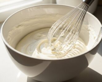 Geniş bir kasede süzme yoğurt ve labneyi pürüzsüz olana kadar çırpın.