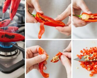 Kapya biberi ocakta veya fırında közleyin. Kabuklarını soyun, iç çekirdeklerini temizleyin ve çok minik doğrayın.