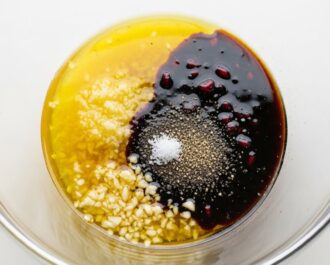 Bir kasede zeytinyağı, rendelenmiş sarımsak, limon suyu, nar ekşisi, tuz ve karabiberi karıştır.