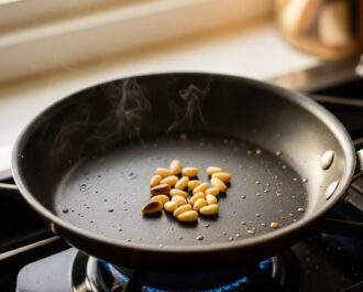 Çam fıstığını tavada 2-3 dakika kadar altın rengi alana kadar kavurun. Bu aroma derinliği kazandırır.