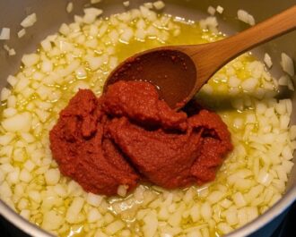 Domates ve (isteğe bağlı) biber salçasını ekleyip 1-2 dakika kavurun. Bu adım salçanın çiğ kokusunu alır.